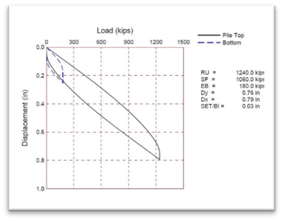 A high-strain dynamic test was performed using the GRL APPLE V drop hammer system. The APPLE V ram mechanism was guided by a boxed lead configuration having approximate dimensions of 8 ft x 8 ft x 20 ft. One weight of approximately 8 tons was used for the test. A load cell was used to obtain dynamic strain measurements (fig. 1). Analog signals from gages were conditioned, digitized, stored, and processed with a Pile Driving Analyzer® (PDA-8G). Force and velocity records were evaluated to determine soil resistance and pile integrity. The ram drop-heights ranged from 2 to approximately 7.2 feet for the tested piles. The data from these drop tests was analyzed in CAPWAP (Case Pile Wave Analysis Program) to estimate static bearing capacity and shaft friction.