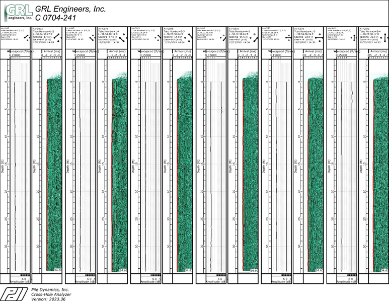 During concrete curing, hydrating cement generates heat, increasing the temperature in the caisson. The individual TAP units automatically record the measured temperature at each sensor location along the length of the wire, at 15-minute intervals, generating a profile of temperature versus depth at each time increment. Figure 1 displays TIP test results from a 42-inch nominal diameter caisson. The crosshole sonic logging results, consisting of waterfall diagrams and corresponding plots of signal first arrival time and signal strength (energy), are provided in CSL testing results are represented in Figure 2. The combination of these testing methods provided a robust representation of the caisson integrity.