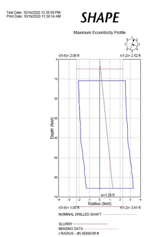Some shafts encountered verticality exceeding the specified limit. When identified, the contractor then corrected the shaft, and the verticality was tested again. Figure 1, as identified below, displays a profile view of the tested shaft that was not within the specified limit of verticality. Figure 3 shows the top of the shaft and the bottom having a centroid offset of 1.28 ft. After correcting the verticality with a slight increase in the excavation radius, another assessment was made with the SHAPE. This time, the shaft centroid was within the specified limit with an offset of 0.06 ft as can be seen in Figures 2 and 4. Figure 5 shows the results of the crosshole sonic logging. By identifying verticality divergence early in shaft construction, contractors can quickly take action to correct excavations, without hindering project timelines.