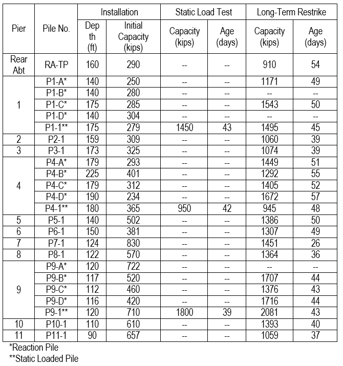 Initial drive testing was performed on each test pile with a target capacity of approximately 650 kips. The anticipated pile capacity following soil setup was approximately twice the initial drive target. Short-term restrikes were performed to assess the relationship of soil setup and waiting time so that future restrike decisions could be made.