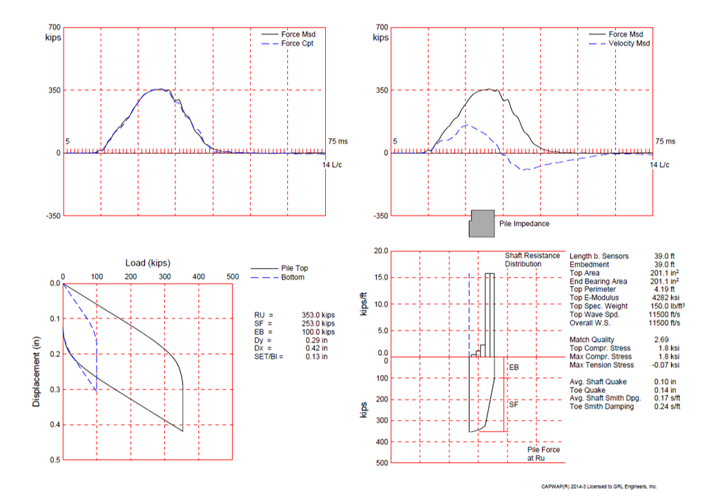 Thermal Integrity Profiling (TIP) measurements were recorded from a single Thermal Wire tied to the full-length pile center reinforcing bar. Figure 1 represents typical Thermal Integrity Profiling (TIP) results of Temperature vs. Depth, Diameter vs. Depth, and the 2D view of the Pile and Soil Profile. CAPWAP results, presented in Figure 2, provide the force measured and computed plot, the analyzed force and velocity measurements recorded with the Pile Driving Analyzer Model 8G (PDA), and a simulated static load test load-displacement plot.