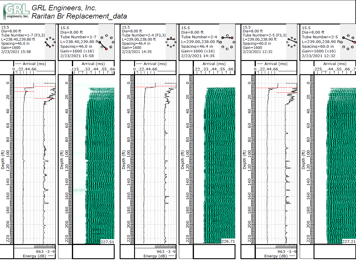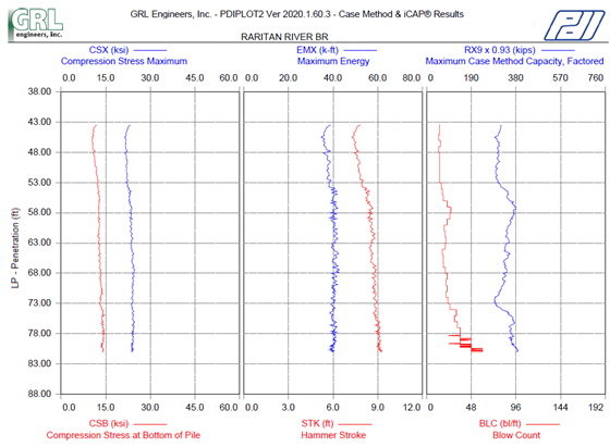 The services provided by GRL Engineers were employed quickly with project schedules in mind. Utilizing multiple integrity testing methods offered a complete picture for assessing concrete quality for the drilled shafts. Low strain integrity testing results indicated no early tension reflections or issues that would need to be further assessed. Crosshole sonic logging results (Figure 1) occasionally showed potential concerns near the top of the shafts, however, this was likely due to debonding effects. Continuously measured temperature readings via Thermal Integrity Profiling cables, shown in Figure 2, offered insight and evidence of the significant temperature reductions near the top of the shaft, which was appropriately corrected during analysis. Figure 3 shows results from dynamic pile monitoring during vibratory hammer installation that was performed. Figures 4 and 5 are outputs that were generated from collected data on impact driven piles. CAPWAP analysis was performed to assess measured stresses along the pile length, soil resistance distribution, and pile capacity.