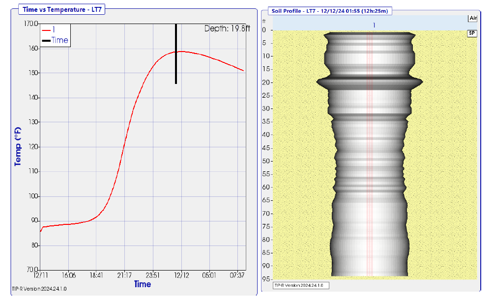 Sample TIP results can be reviewed in Figure 1, which presents the Measured Temperature vs Depth on the left plot and the soil/pile profile on the right plot. The temperature roll-off at the top of the pile is caused by heat loss due to the grout/air interface. Sample PIT results are shown below.