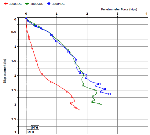 The test shaft was a drilled shaft with an embedded length of 125.1 feet, cased and uncased nominal diameters of 72 and 70 inches, respectively. The boring log indicated subsurface conditions consisting primarily of clay and sand, and partially weathered rock at 40‑foot depth. The Shaft Area Profile Evaluator (“SHAPE”) device was attached to a Kelly bar and lowered into the shaft to assess the foundation’s excavation profile. The maximum eccentricity profile from SHAPE is shown in Figure 1. In addition to the verticality assessment, a shaft base cleanliness evaluation was performed with the Shaft Quantitative Inspection Device (“SQUID”). The SQUID was attached to the Kelly bar and lowered into the shaft where it encountered debris material at the shaft base. The device used force and displacement measurements on three penetrometers to assess debris thickness. The debris was within the specification requirements. Sample SQUID results are shown in Figure 2.