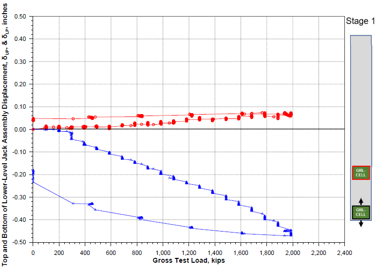 Two levels of jack assemblies on the BDSLT permitted staged testing with the intent of maximizing mobilized resistance in specific portions of the test shaft. Stage 1 consisted of pressurizing the lower-level GRL-Cell while the mid‑level GRL-Cell remained welded closed. Stage 2 consisted of pressurizing the mid-level GRL‑Cell with the hydraulic lines to the lower‑level jack open, allowing the lower-level GRL-Cell to drain and retract. Stage 3 consisted of pressurizing the mid‑level GRL-Cell with the hydraulic lines to the lower-level GRL‑Cell closed, rendering the lower-level GRL-Cell locked (unable to drain). The maximum jack assembly force achieved was 1,987 kips, 2,194 kips, and 2,193 kips for Stages 1, 2, and 3, respectively. For each stage, unloading was accomplished in decrements equal to approximately 20% of the maximum jack force achieved. Figure 5 represents Stage 1, Figure 6 represents Stage 2, and Figure 7 represents Stage 3 results.